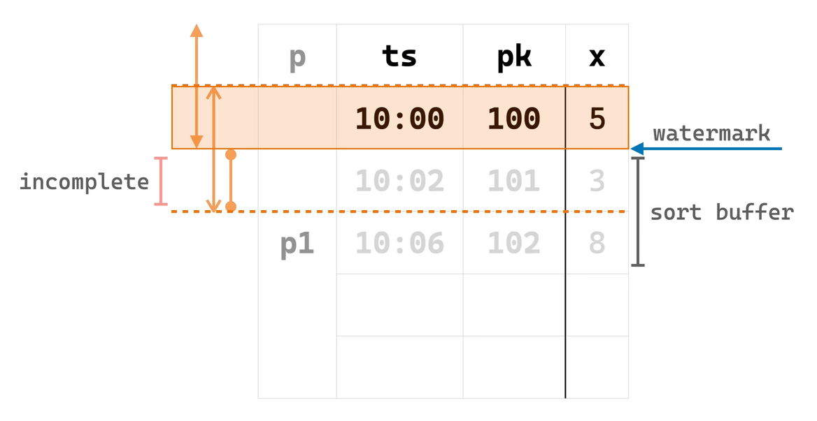 第一阶段是对输入行的一个缓冲,又由于 watermark 的非递减性质,很容易把第一阶段的输出实现为是有序的,因此我们把第一阶段命名为 SortBuffer。更进一步,我们引入了一个名为 EowcSort 的算子来解耦 SortBuffer 与第二阶段,使 SortBuffer 可以在其他需要的地方复用。于是,EowcOverWindow 算子以 EowcSort 作为上游,其内部只需对满足条件 ① 的有序输入行实现第二阶段。