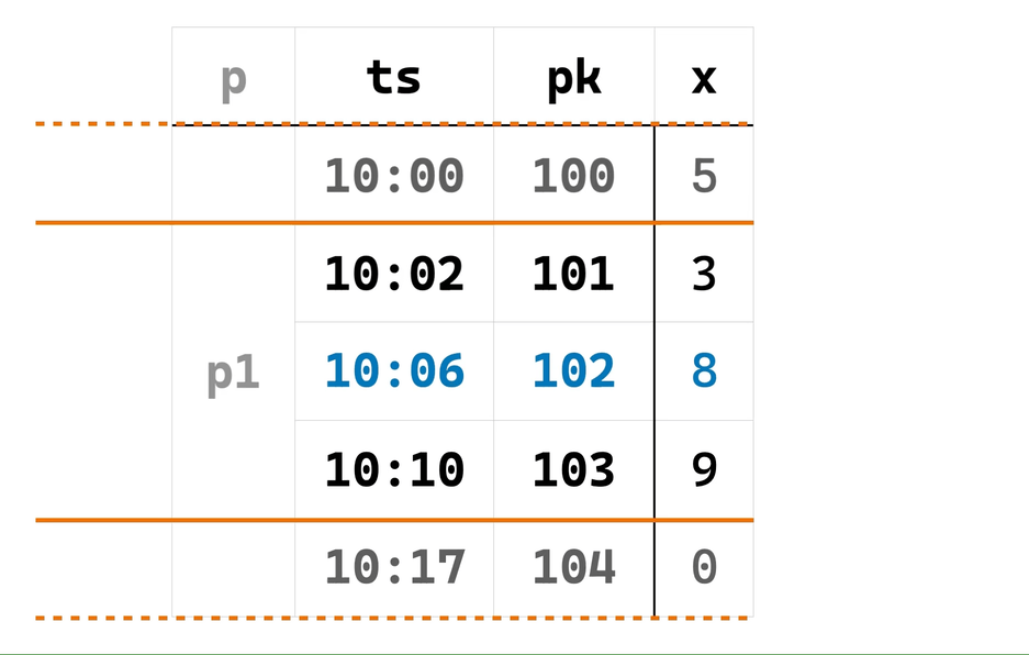 按照所指定的窗口函数 frame,要计算 pk = 102 行的窗口函数结果,需要向前找一行、向后找一行,也就是说,CURRENT ROW 为 102 行的“当前窗口”范围是从 101 行到 103 行。