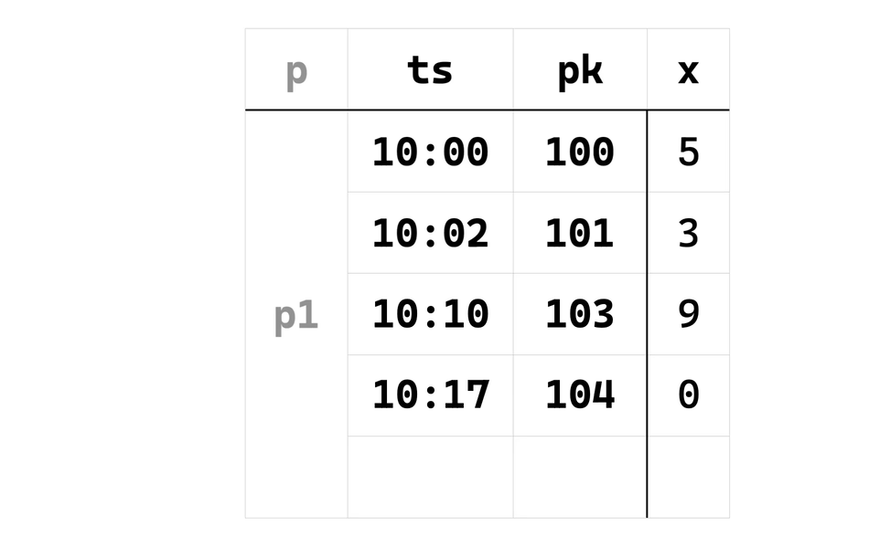 例如,考虑上一节最后的查询例子(去掉 EMIT ON WINDOW CLOSE 关键字),假设我们已有如下数据: